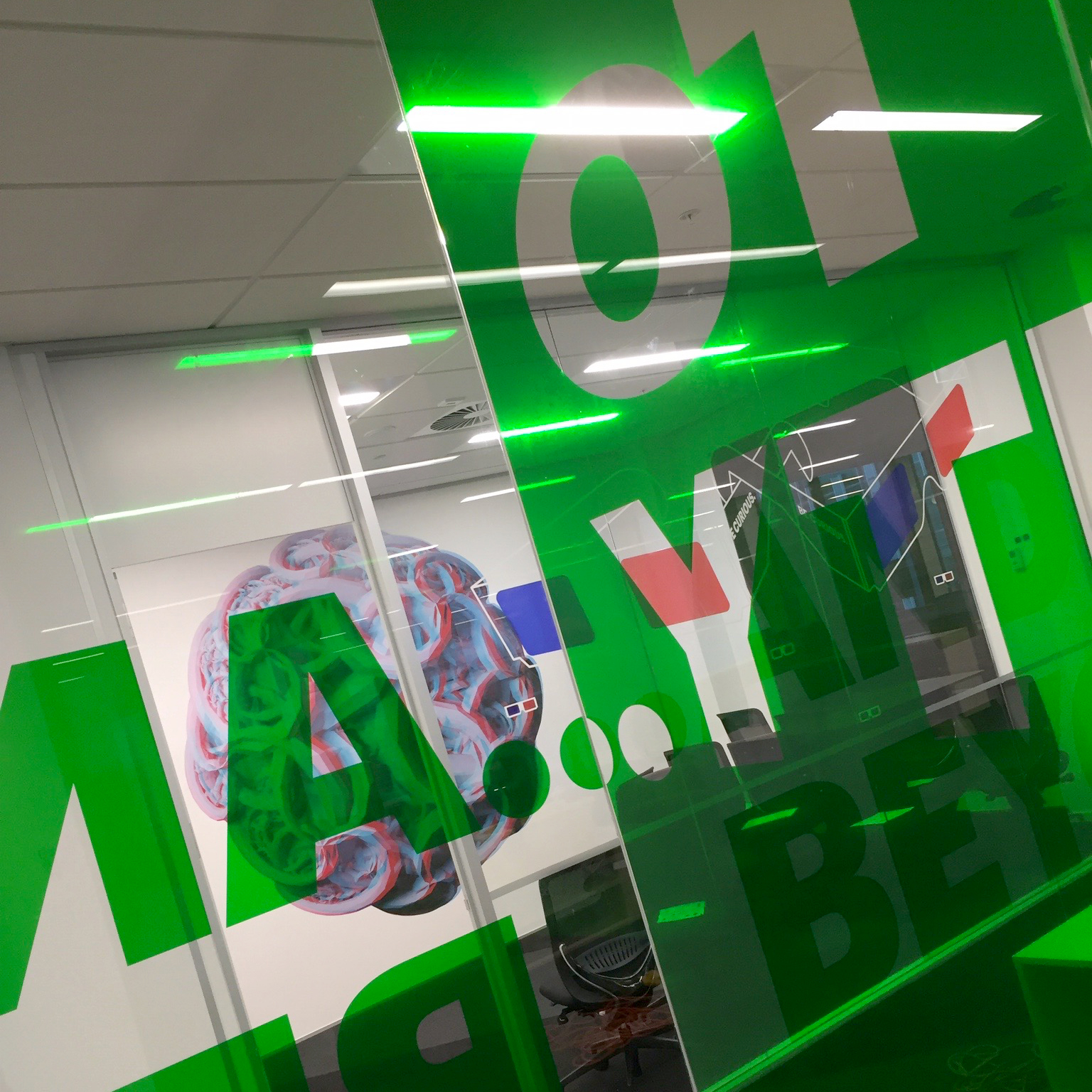 We implemented various interactive features around the offices, including a 3D visual illusion which popped off the wall when viewed through 3D glasses made from transparent red and blue vinyl. Bursts of colour appear around every corner with transparent films, complimenting each radio station’s router-cut logos mounted on the walls.